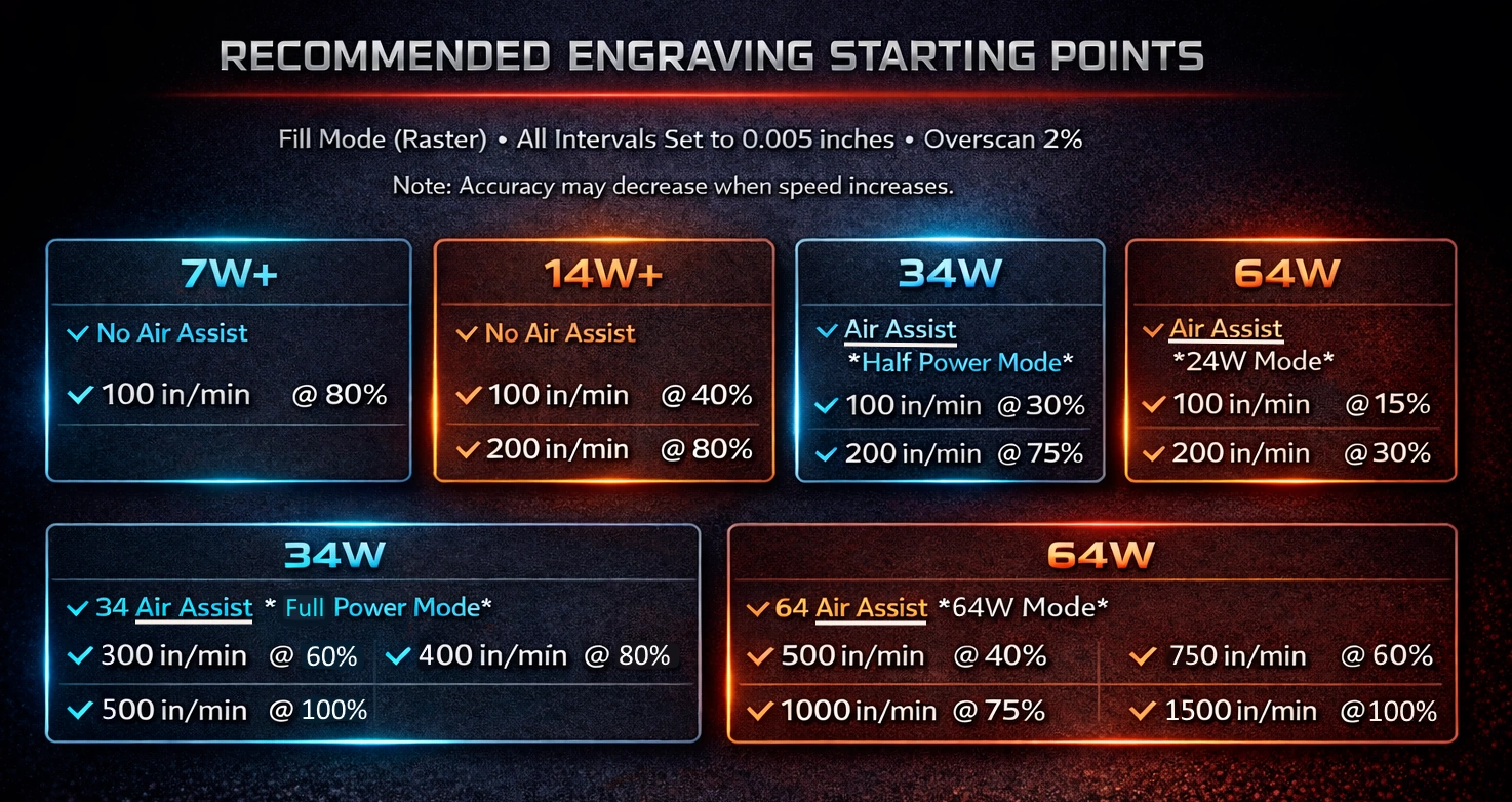 ➡️ 7W+ or 14W+ — best choice for engraving detail at a good cost.