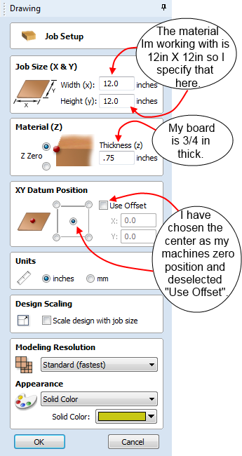 Once you have created your new laser tool and added it to the VCarve Pro “Tool List” you can move on to your “Material Setup”. Following the steps below will ensure that your laser maintains a constant Z height while engraving and avoids plunge moves which would waste time and create unsightly burns at the start of each path.