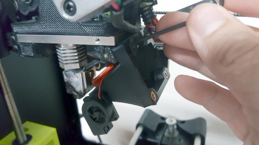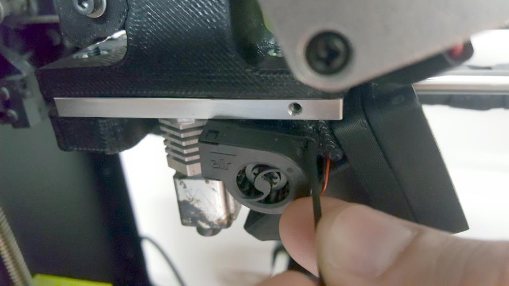 If you have it, the good news is it just needs one additional screw! You do need to get a small M3 screw and it will mount to the existing little hole in the aluminum plate on the extruder mount. Take the other screw from the left of the assembly off and put it through the new mount.
