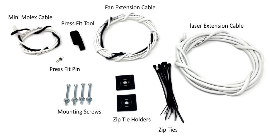 - Laser and Fan Extension Cables: 10 ft extension cables for the laser and fan.
